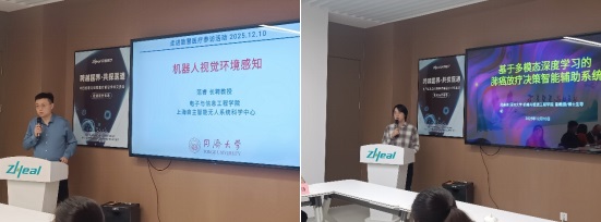 随后,“医疗+人工智能”主题分享沙龙拉开帷幕。致慧医疗科技(上海)有限公司董事长、同济大学医学院教授陈炳地介绍公司基本情况,强调了人工智能技术对推动医疗行业升级的重要性。同济大学九三社员、电子与信息工程学院范睿教授以《机器人视觉环境感知》为题,讲解了视觉环境感知技术在医疗领域场景的技术突破与应用;机械与能源工程学院段春艳副教授聚焦《基于多模态深度学习的肺癌放疗决策智能辅助系统》,深入剖析了多模态深度学习技术在癌症放疗精准定位、方案优化等环节的应用逻辑,引发现场热烈讨论。